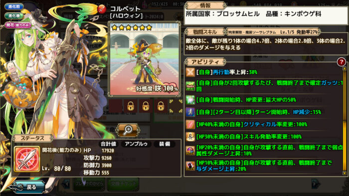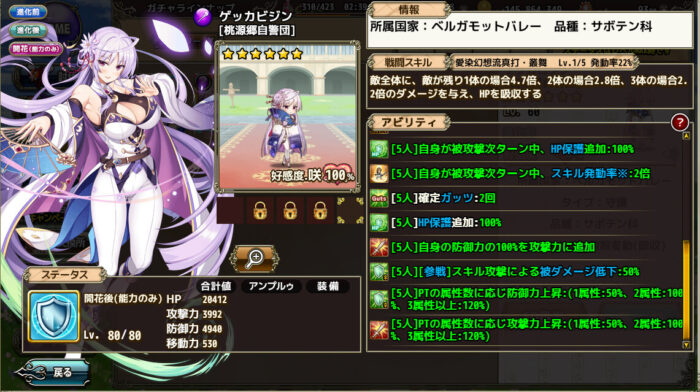 など、自身のHPが50%未満なら自警団ゲッカビジンさんと同じく防御力を100%攻撃バフにする強力な効果を持っています。