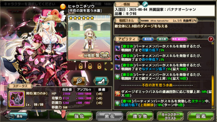 極限任務リクルス戦の3戦目が斬属性縛りだった事もあり、一人でデバフ役を任せられるダチュラさんは持っていたら絶対入れたいキャラです。