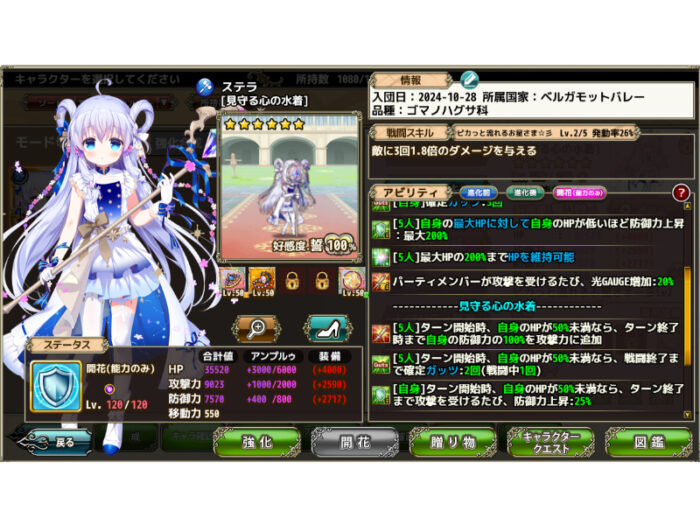固有スキルはHP吸収持ちであり、全体にガッツ2回+HP保護100%+自身が被弾時さらにHP保護100%+被ダメ低下50%。