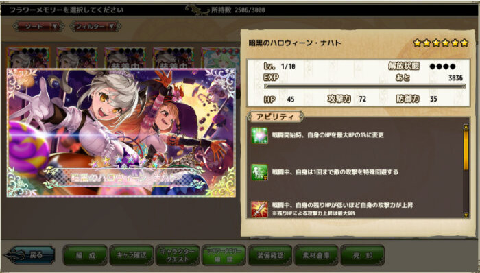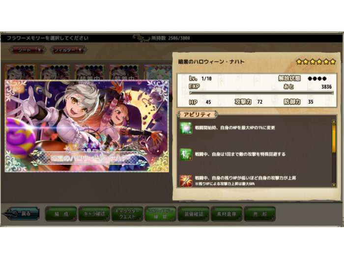 戦闘開始時に装備者のHPを1%にする「暗黒のハロウィーン・ナハト」や、