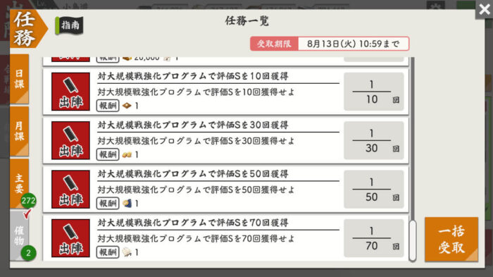 今回また小判を消費するイベントの関係上、小判が底を尽きそうなら小判を貰える遠征を中心に回していきましょう。