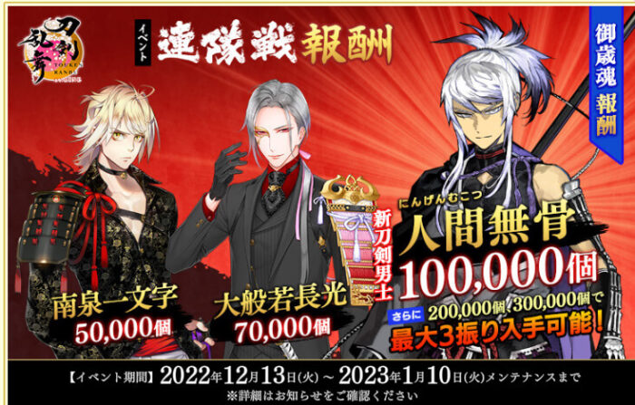 偶にしか復刻しない南泉さんと、去年と同じく大般若さんが達成報酬です。